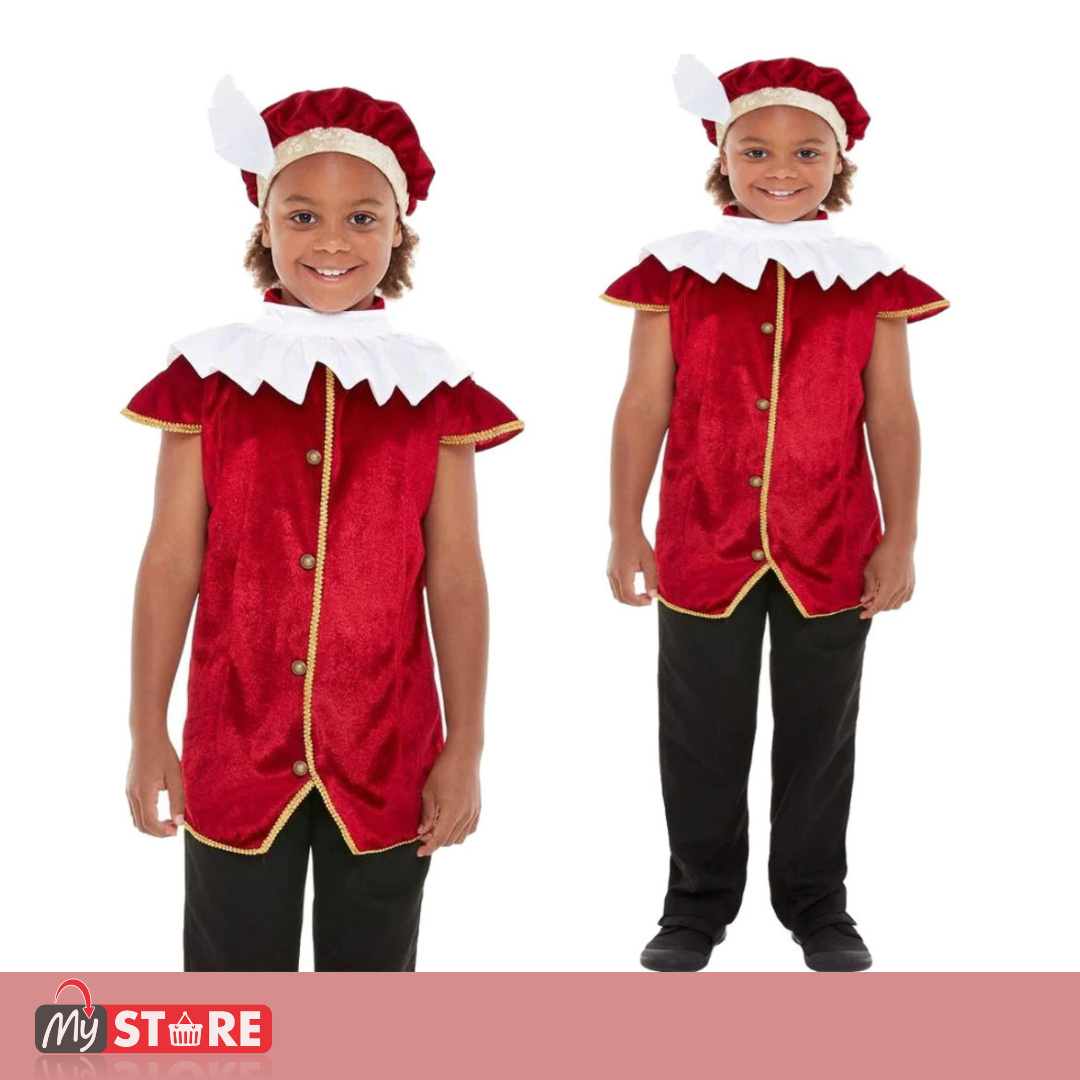 Вашето дете ќе изгледа како вистински мал принц со овој елегантен костим во црвена боја со златни детали и бела јака. Совршен за претстави, родендени, карневали или училишни настапи!